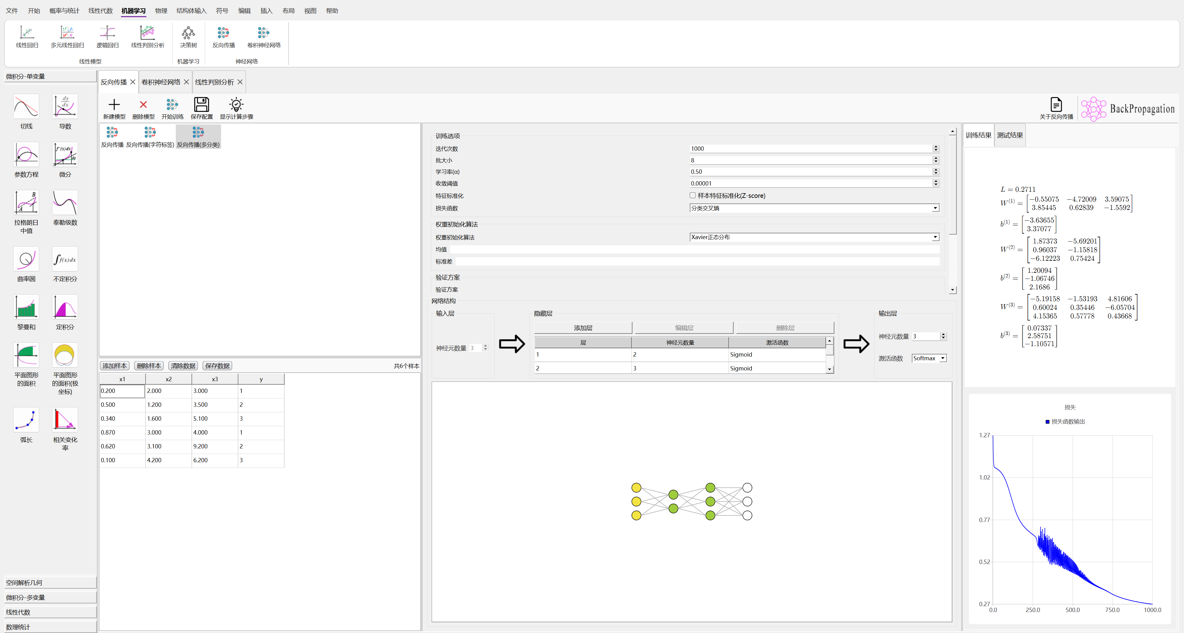 在QkCalc你可以快速建立反向传播算法模型,设定训练参数,包括:误差函数、激活函数,通过图形化方式定义神经网络结构,查看可视化的训练结果和损失的收敛。
