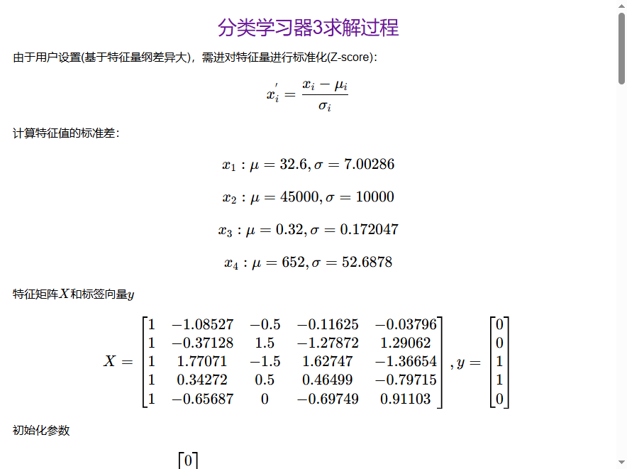 机器学习算法由于需要对大量样本进行训练,涉及到大量的矩阵和统计运算,因此机器学习算法中的求解步骤只会显示部分样本的计算过程,求解步骤会列出使用的计算公式和运算过程,对于行/列数很大的矩阵,将只显示部分的行和列。