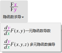 在计算文档中插入二元隐函数的求偏导符号,该符号的括号内有两个输入框,第一个框表示求导的隐式函数,该函数必须转换为$F(x,y,z)=0$的形式。第二个输入框中包含两个符号$y,x$,其中$y$在前,$x$在后。其意义是$y$对$x$求偏导数。根据隐函数的存在定理,方程$F(x,y,z) = 0$:的偏导数公式为: