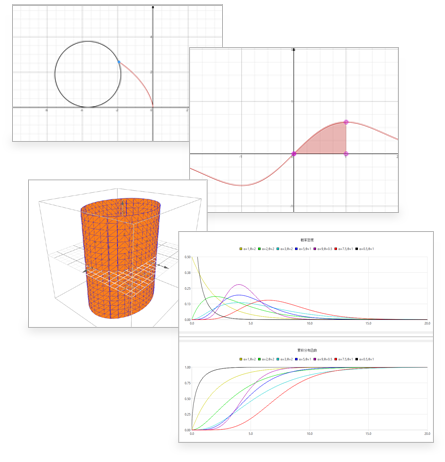 定积分、不定积分、黎曼和、平面图形的面积、平面图形的面积(极坐标)、弧长。
