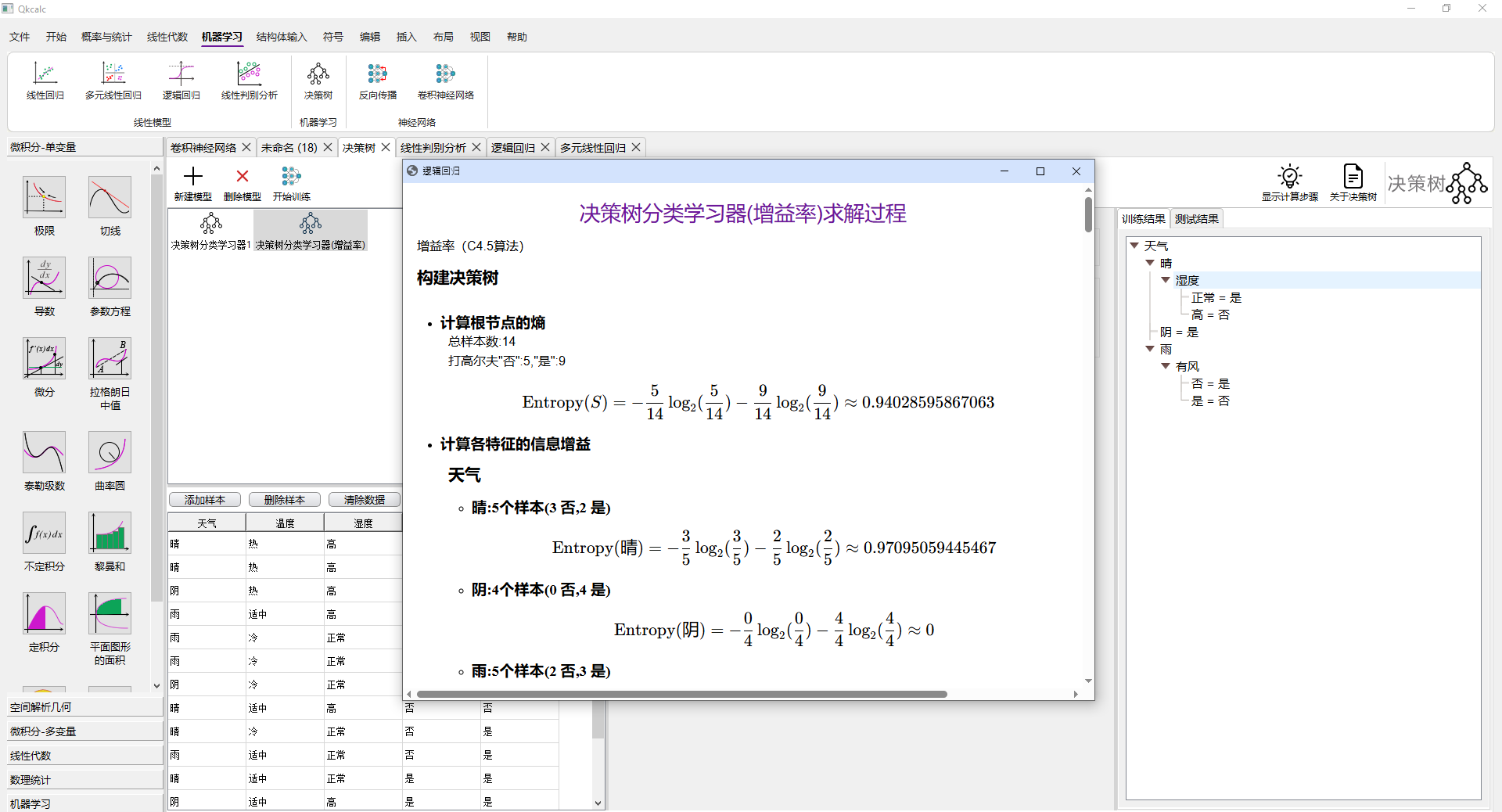 提供传机器学习算法的建模,用户通过QkCalc图形界面建立样本、训练并调整参数。所有机器学习算法详细的求解步骤和算法说明文档。