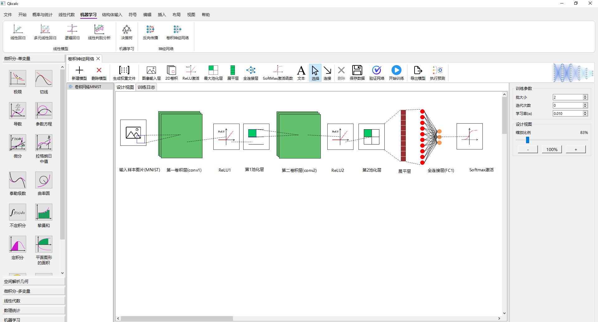 从传统的机器学习算法,到深度学习算法建模,QkCalc提供可视化的界面,协助用户建立样本、通过算法训练样本、评估训练结果和建立模型。与其他符号计算一样,AI算法的计算过程同样可以获取计算步骤信息,让你对算法过程了如指掌,从而获取优化算法的最佳测试途径。