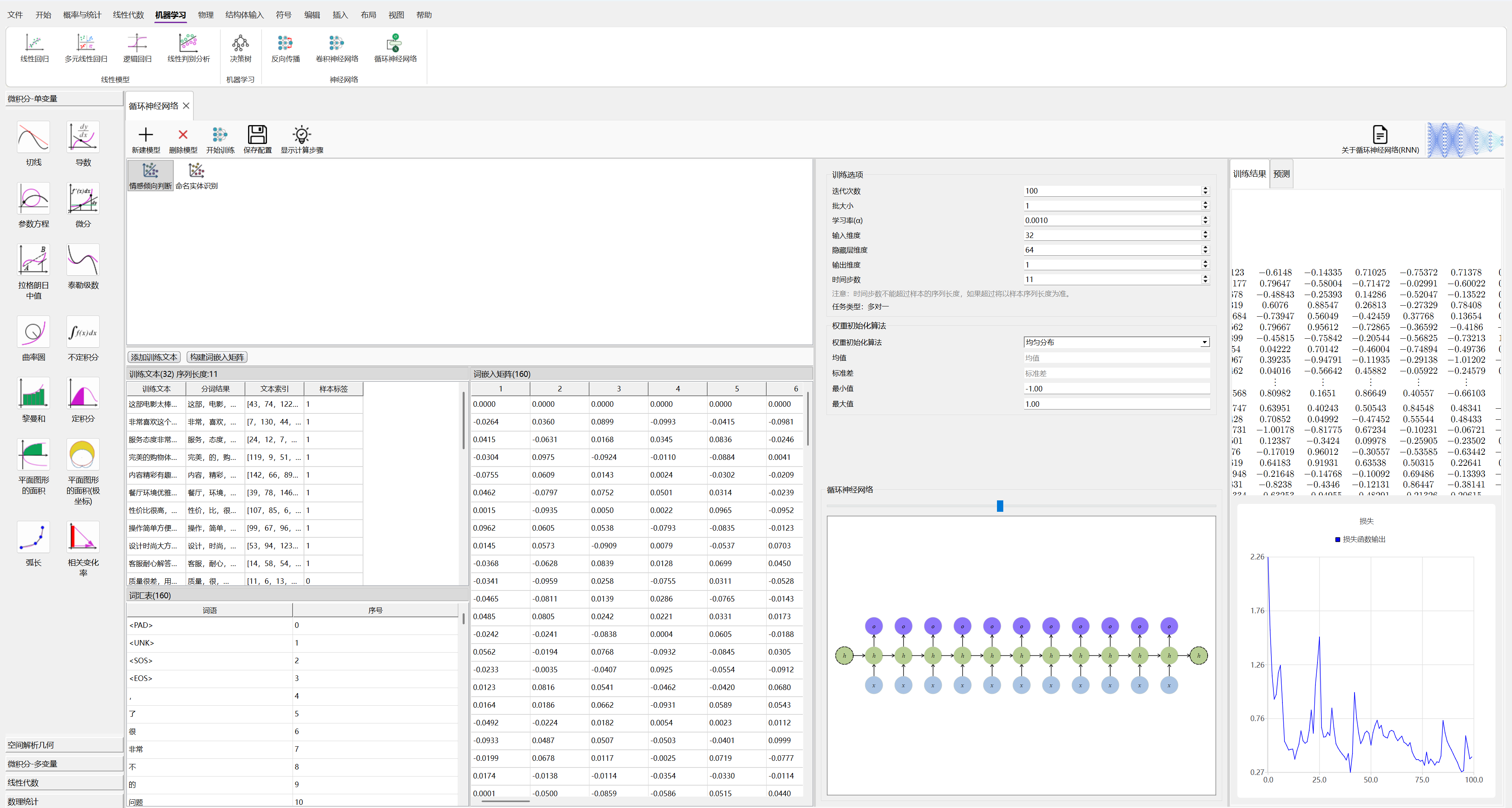 在QkCalc中,你可以通过“循环神经网络”来建立有关RNN的模型,在该模块中,你可以建立不同类型的RNN网络,生成样本词嵌入矩阵进行训练,查看训练结果和进行预测。