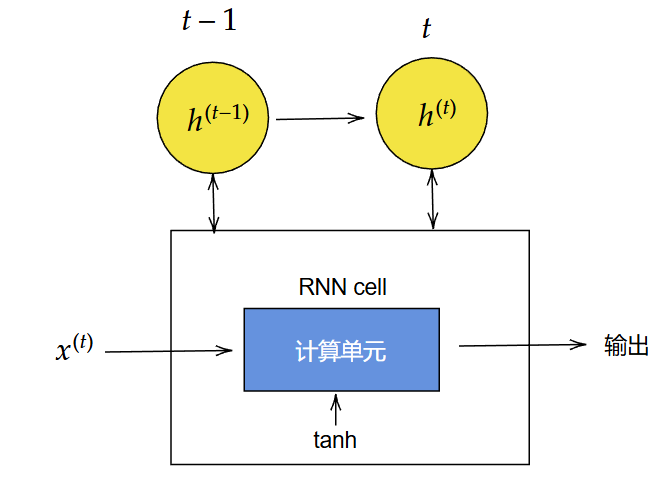 - 循环连接: 注意,从 $h^{(t-1)}$ 指向 $h^{(t)}$ 的箭头。这就是“循环”所在,它意味着当前的状态 $h^{(t)}$ 是由当前输入 $x^{(t)}$ 和前一状态 $h^{(t-1)}$ 共同计算得出的。
