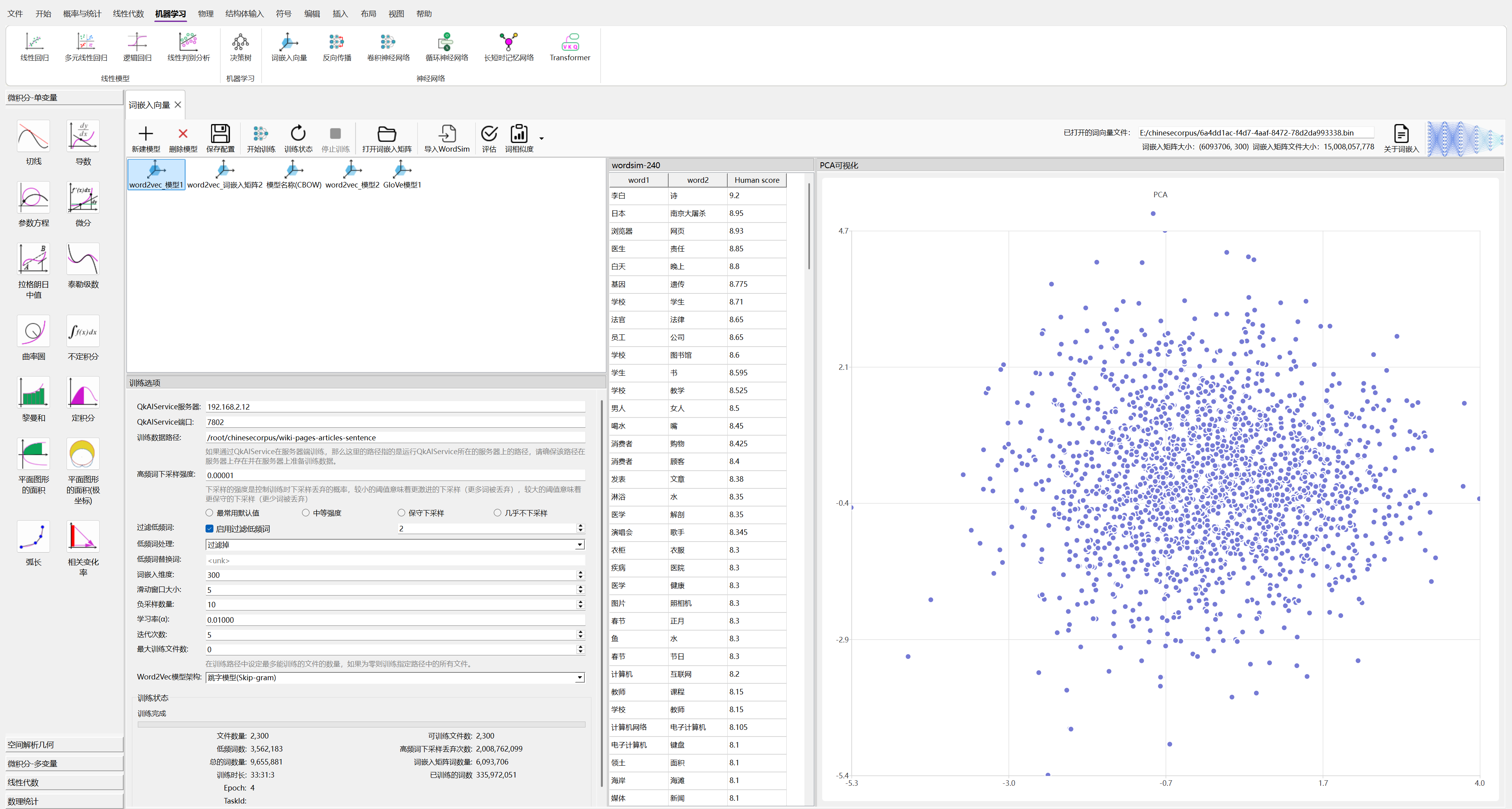 在QkCalc中可以使用“机器学习”中的“词嵌入向量”创建和训练Word2Vec模型,具体的训练是通过QkAIService服务来完成。通过QkCalc可对该服务进行管理并对训练的结果进行评估。