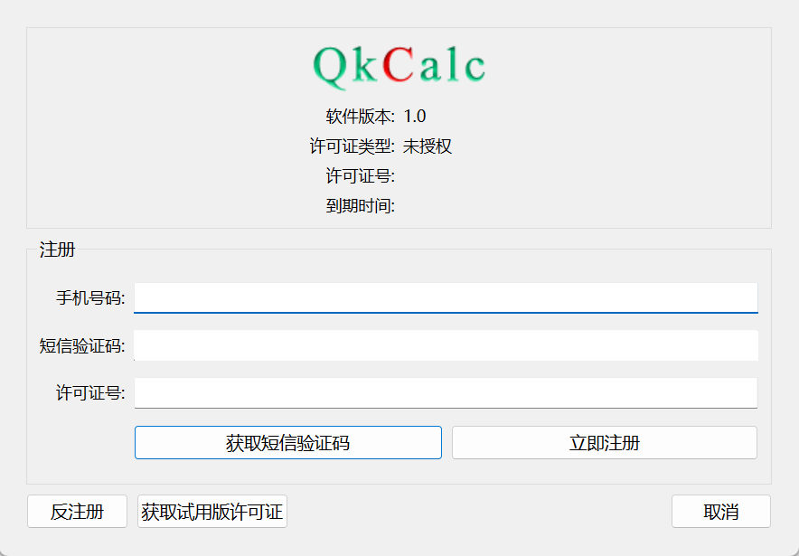 注册软件是指在购买许可证之后,通过QkCalc的激活功能使得软件通过授权,从而使用软件完整功能的过程。购买软件请点击购买,注册界面如下: