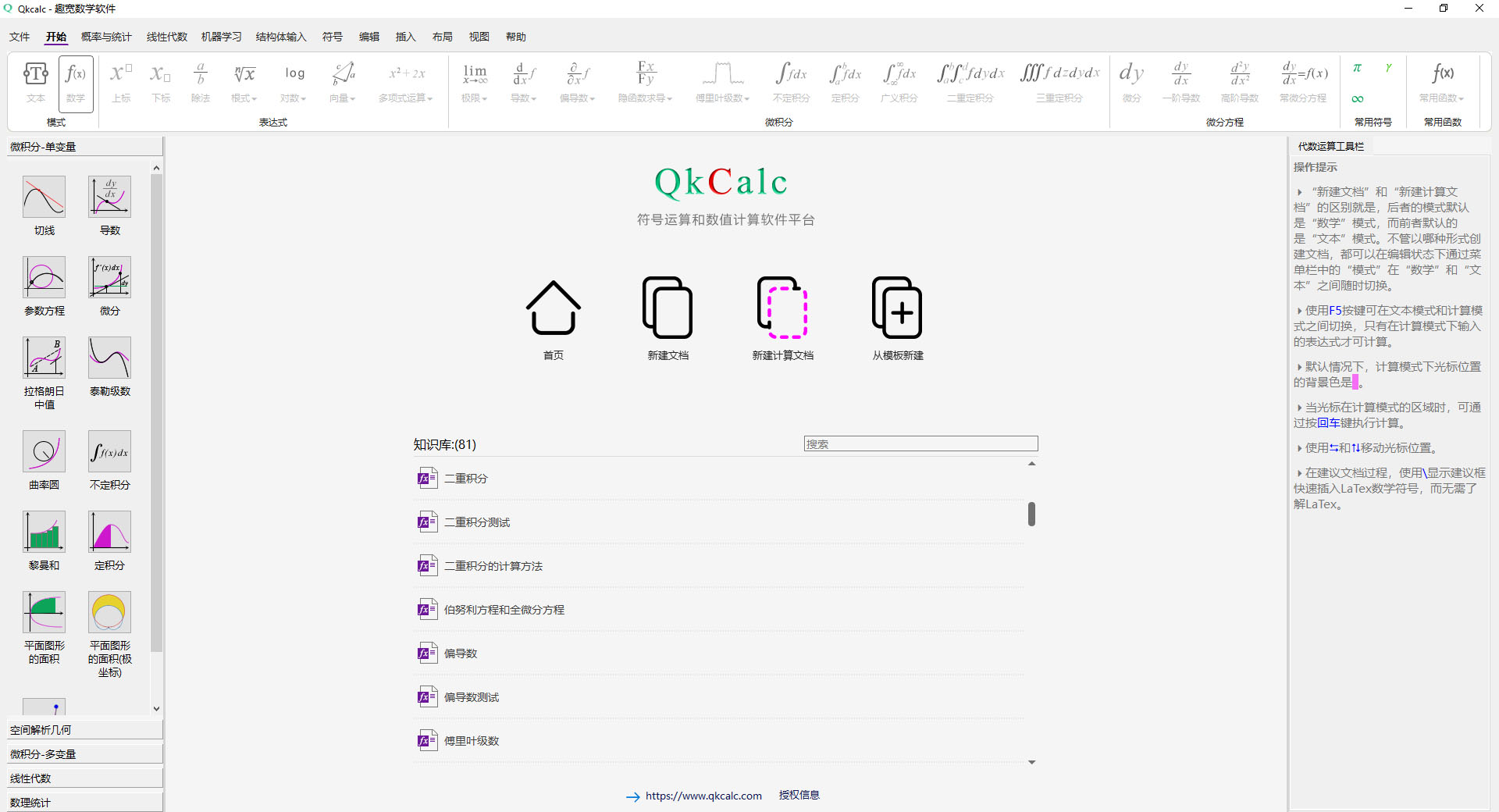 新建文档的选项有:1.新建文档;2.新建计算文档;3.从模板新建。新建文档和新建计算文档的区别是:后者默认进入计算模式,而前者默认是文本模式。不管是哪种模式,都可以在新建后通过菜单中的“模式”在文本和计算之间随时切换。从模板创建是根据模板创建新的文档。
