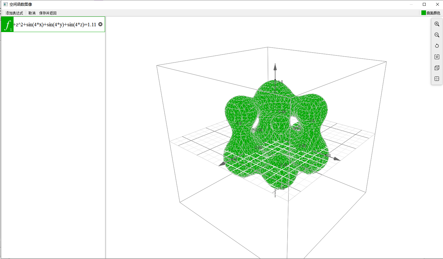 在“空间函数图像”对话框中,可以添加多个函数。空间曲面除了支持一般的二元函数图像外,也支持隐式函数的绘图,例如: